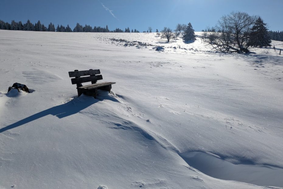 Bild vom letzten Freitag – Die noch einsame Ruhebank neben der Loipe wartet auf den Frühling.
